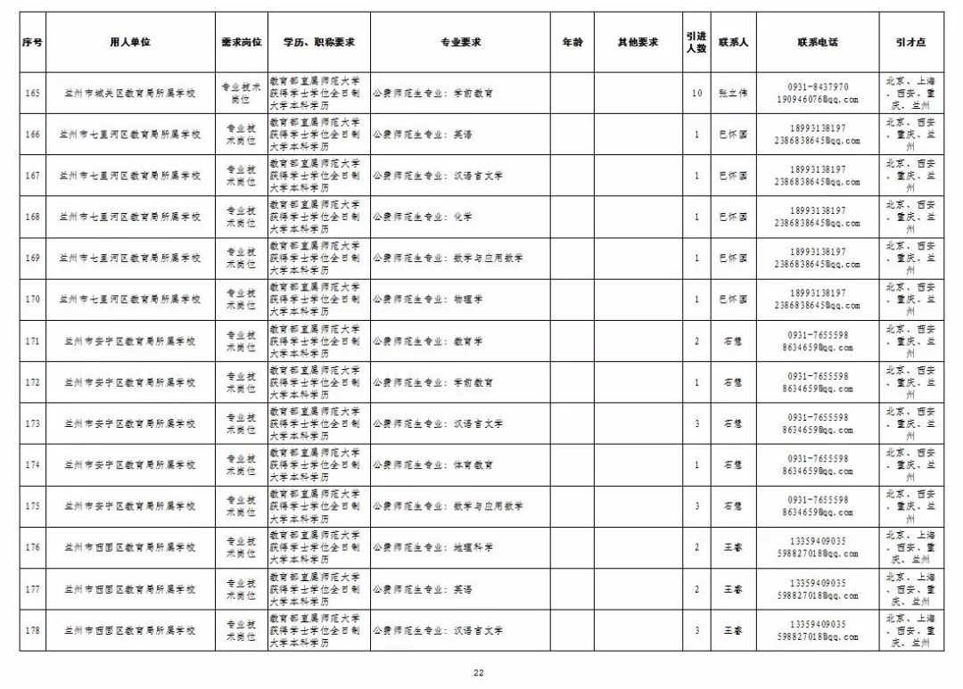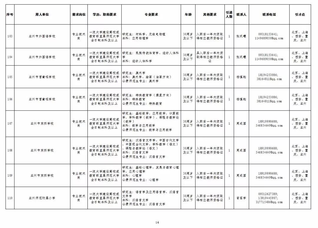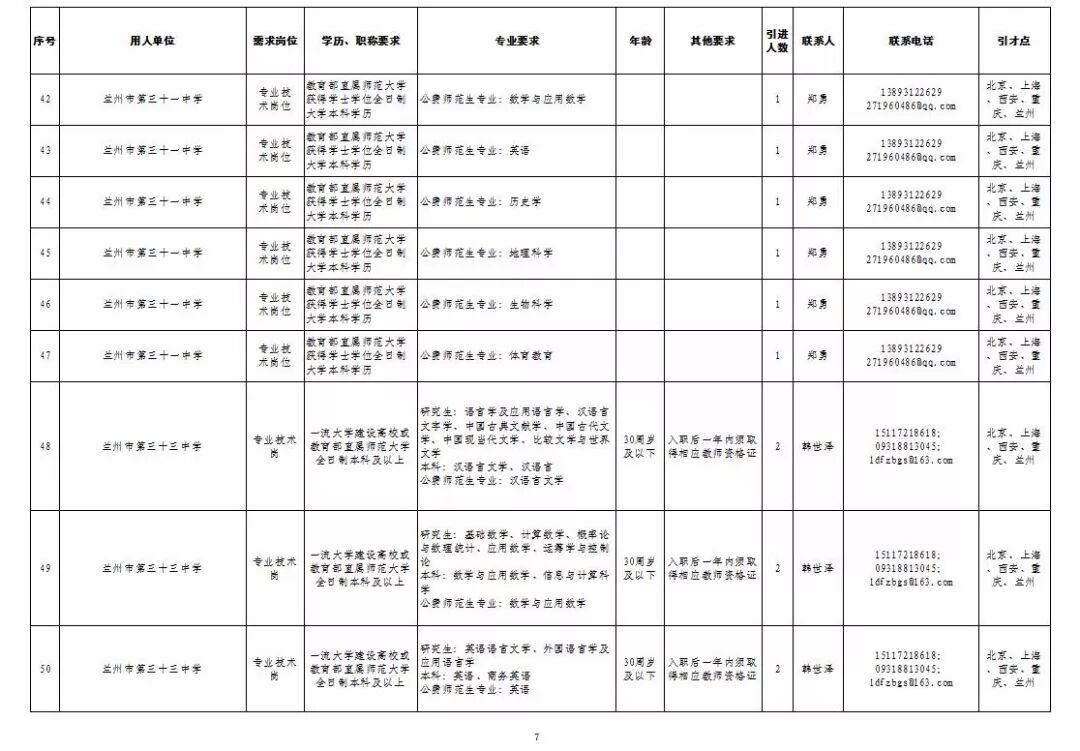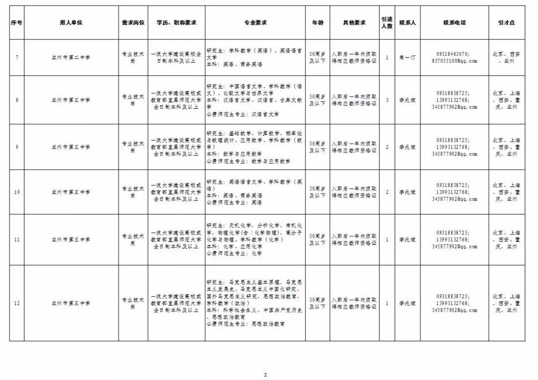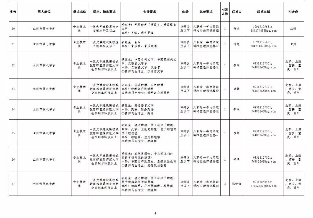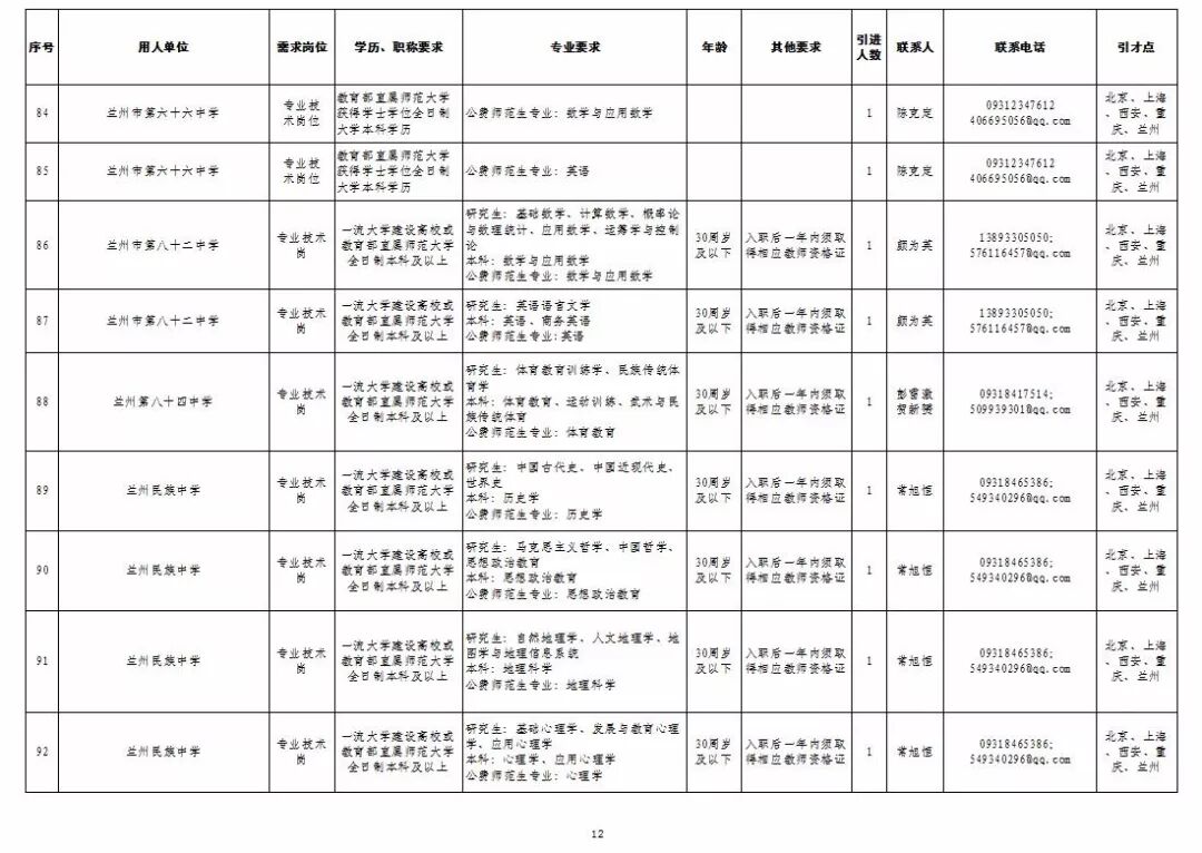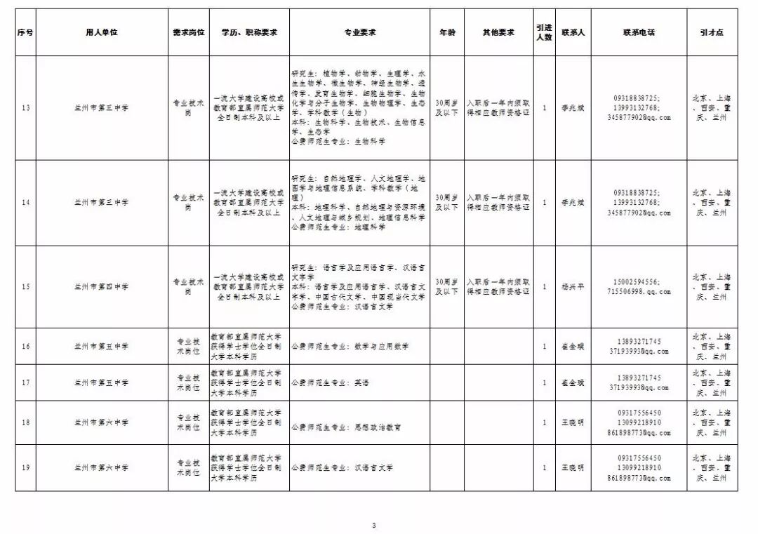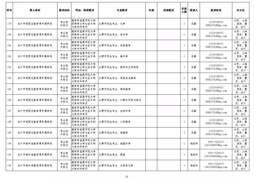 为深入实施人才强市战略,加强我市教育人才队伍建设,兰州市教育系统面向国家“一流大学建设高校”和教育部直属师范大学引进急需紧缺人才及公费师范生,具体岗位及条件见“2019年兰州市公开引进急需紧缺人才公告”和“兰州市教育系统公开招聘2020届公费师范生公告”,查询网址:兰州市人力资源和社会保障局官网(http://www.gslz.lss.gov.cn)和兰州市教育局官网(http://jyj.lanzhou.gov.cn/)。